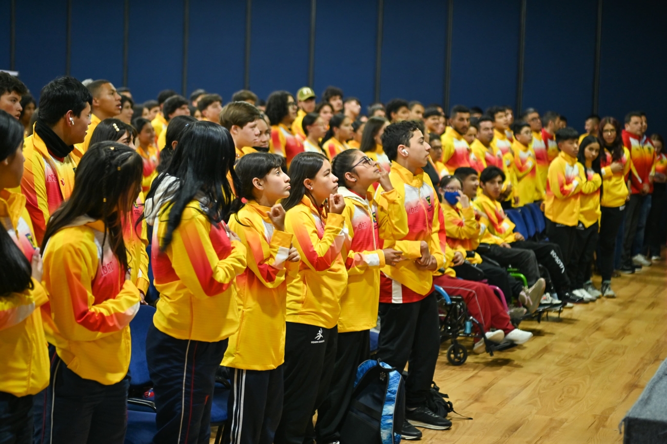 Posteriormente, se realizó la ceremonia de la entrega de la bandera por parte de Gabriel Lagos a los estudiantes-deportistas Luna Camila Aguilera, destacada representante del atletismo, y Ricky Zhenyang Tan-Li, joven promesa del tenis de mesa, quienes fueron los abanderados. Ricky, además, fue el encargado de tomar el juramento de los deportistas.
