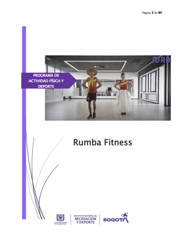 Guia del IDRD que estructura sesiones de Rumba Fitness con enfoque pedagógico y técnico, buscando mejorar la salud física y mental mediante el baile y ritmos nacionales e internacionales.